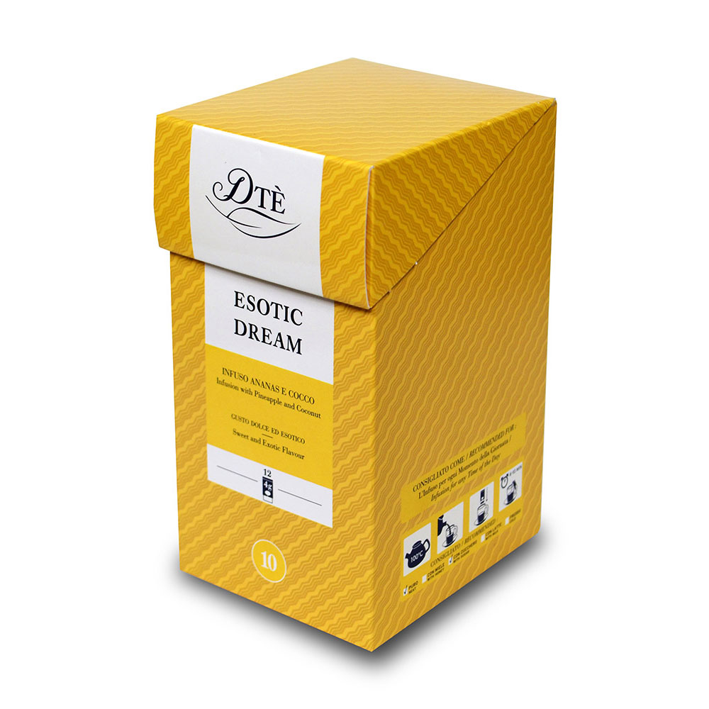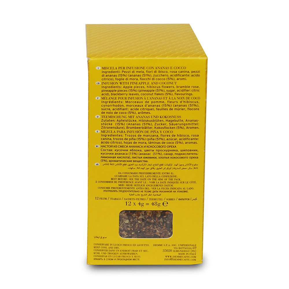 - Infusión tropical con trozos enteros de copos de piña y coco, trozos de manzana, rosa de perro e hibisco, con un sabor afrutado con una nota delicada y particular de piña y coco.