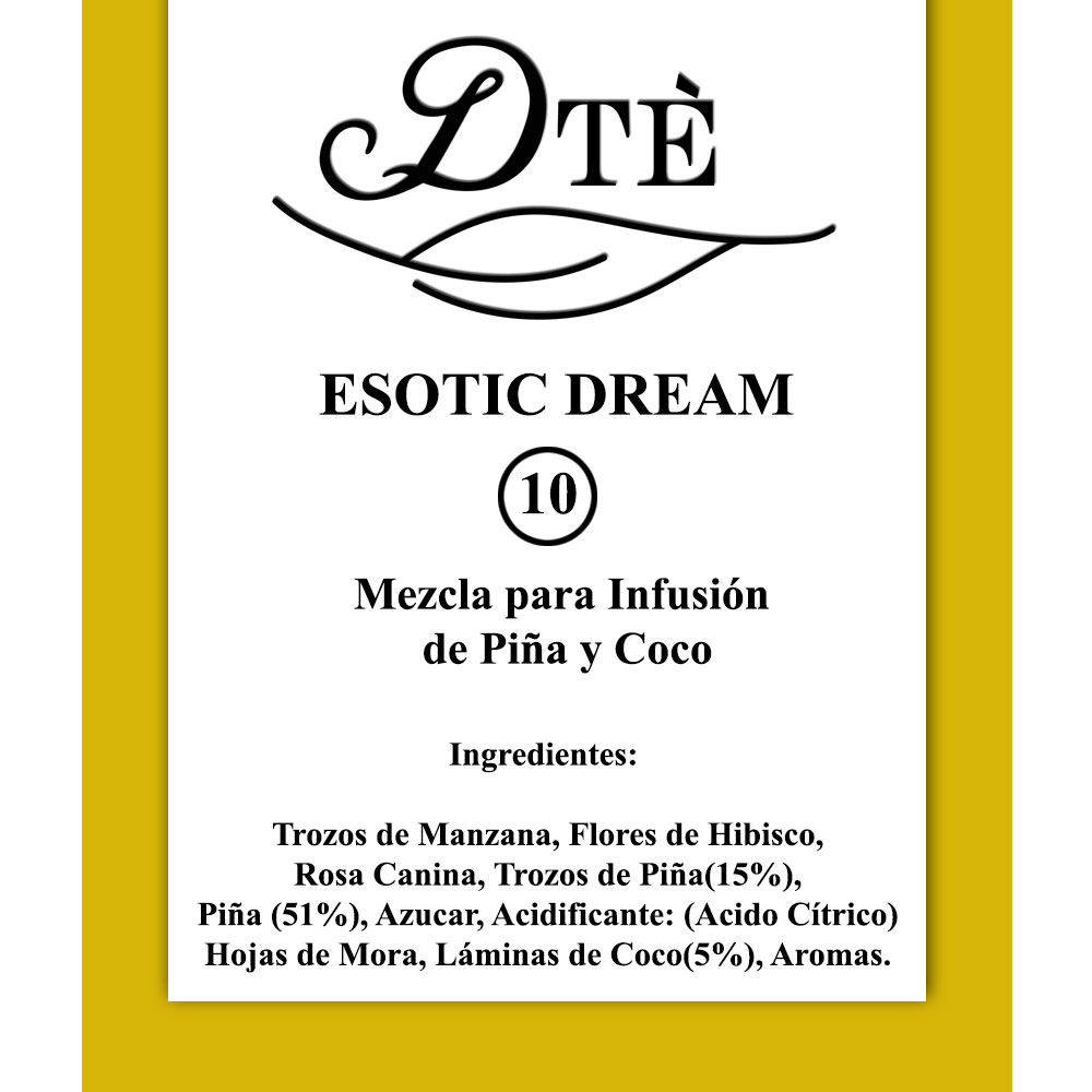 - Esotic Dream: trozos de manzana, flores de hibisco, rosa canina, trozos de piña, hojas de mora, laminas de coco.